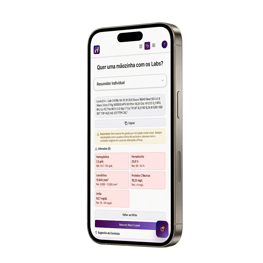 Com um clique você tem o Resumo, a Análise e a Sugestão de Condutas para um exame alterado em segundos.